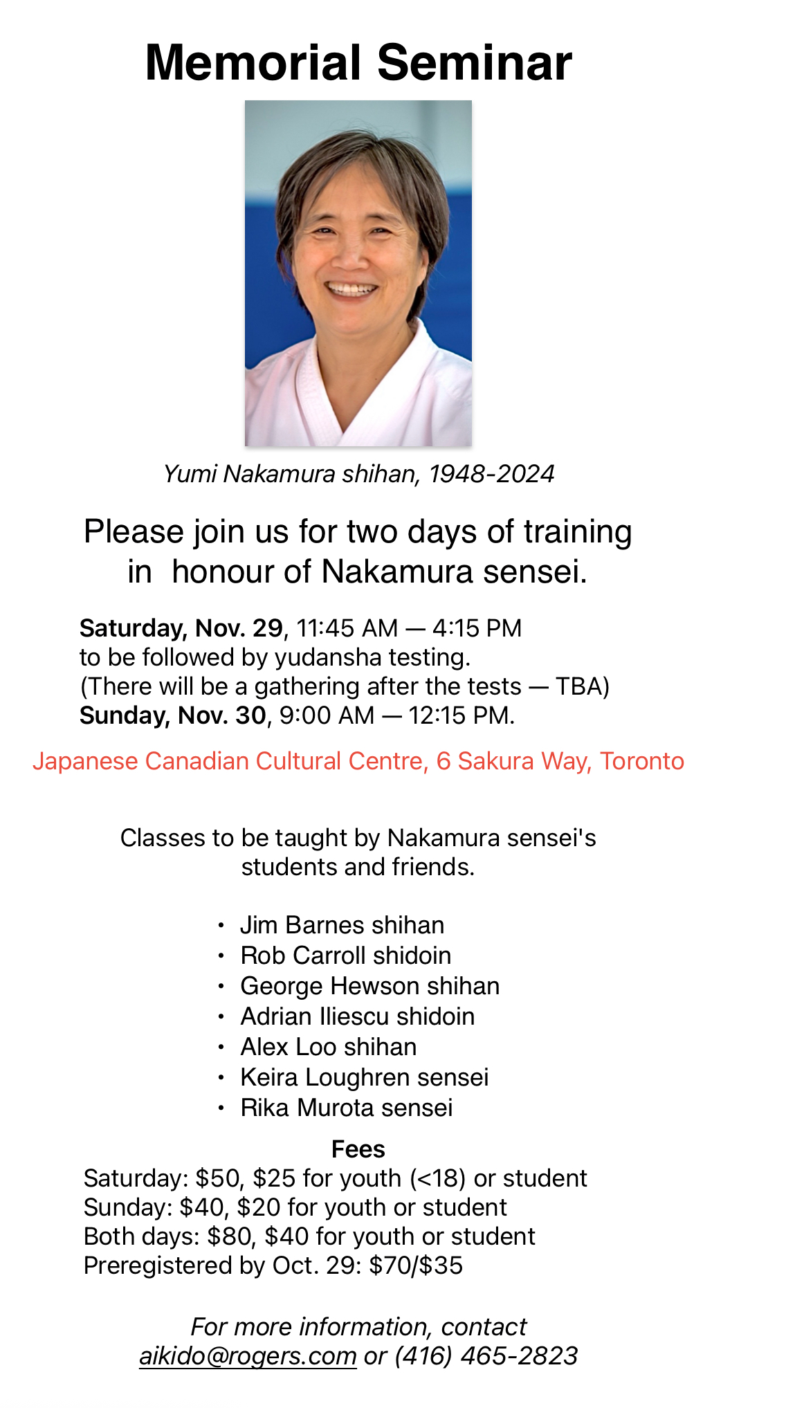 Classes will be taught by Nakamura sensei’s students and friends: